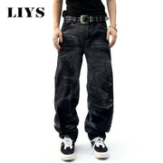 Autumn Men's Black Personalized Straight Leg Retro Jeans American Street Splashed Ink Loose Unisex Denim Pants Trendy Trousers - Black / XL
