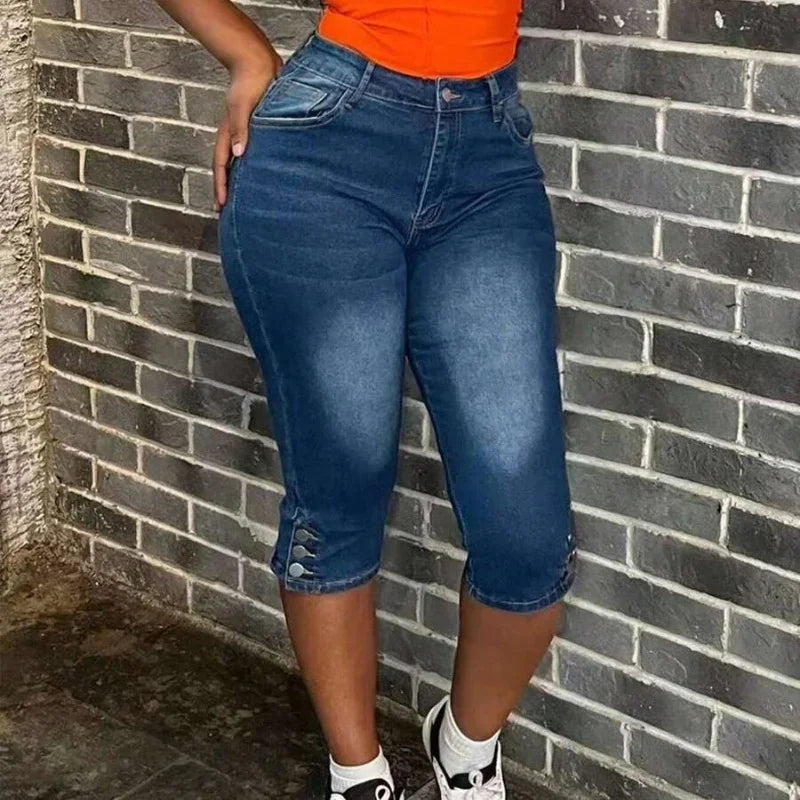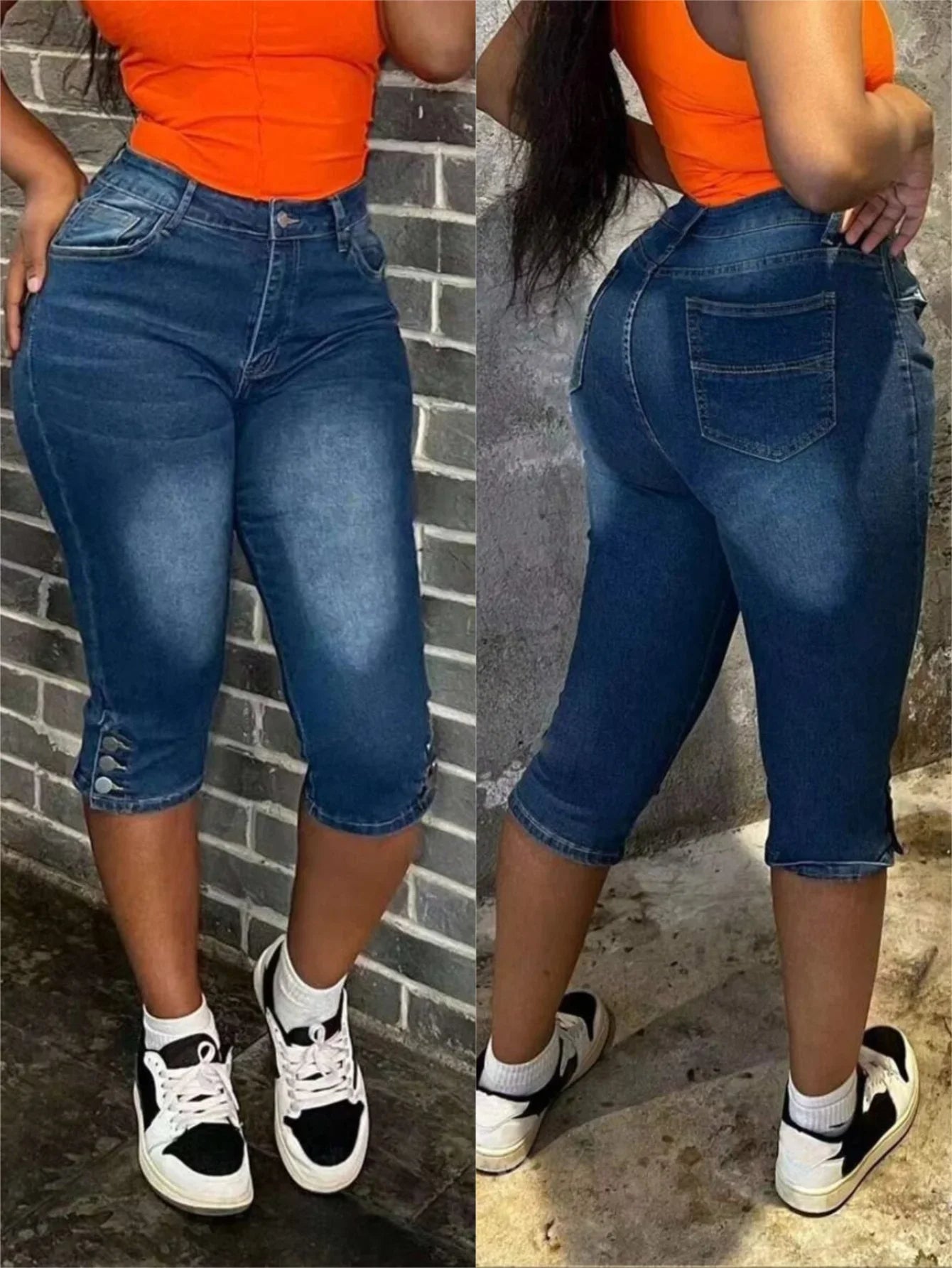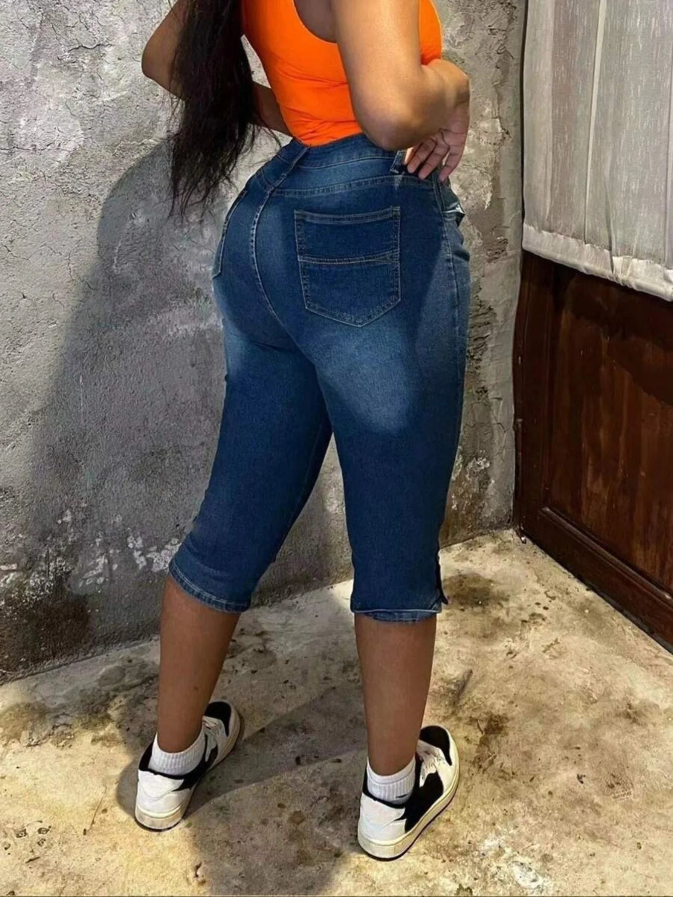 Plus size women's elegant dark blue high waist skinny cropped jeans