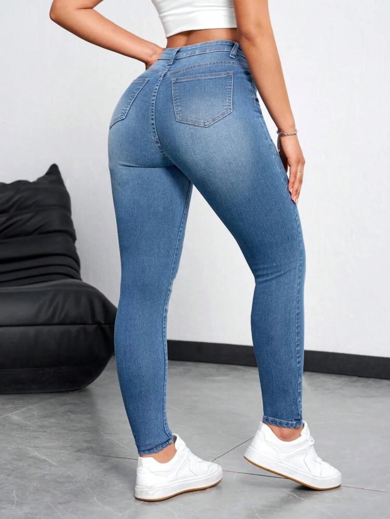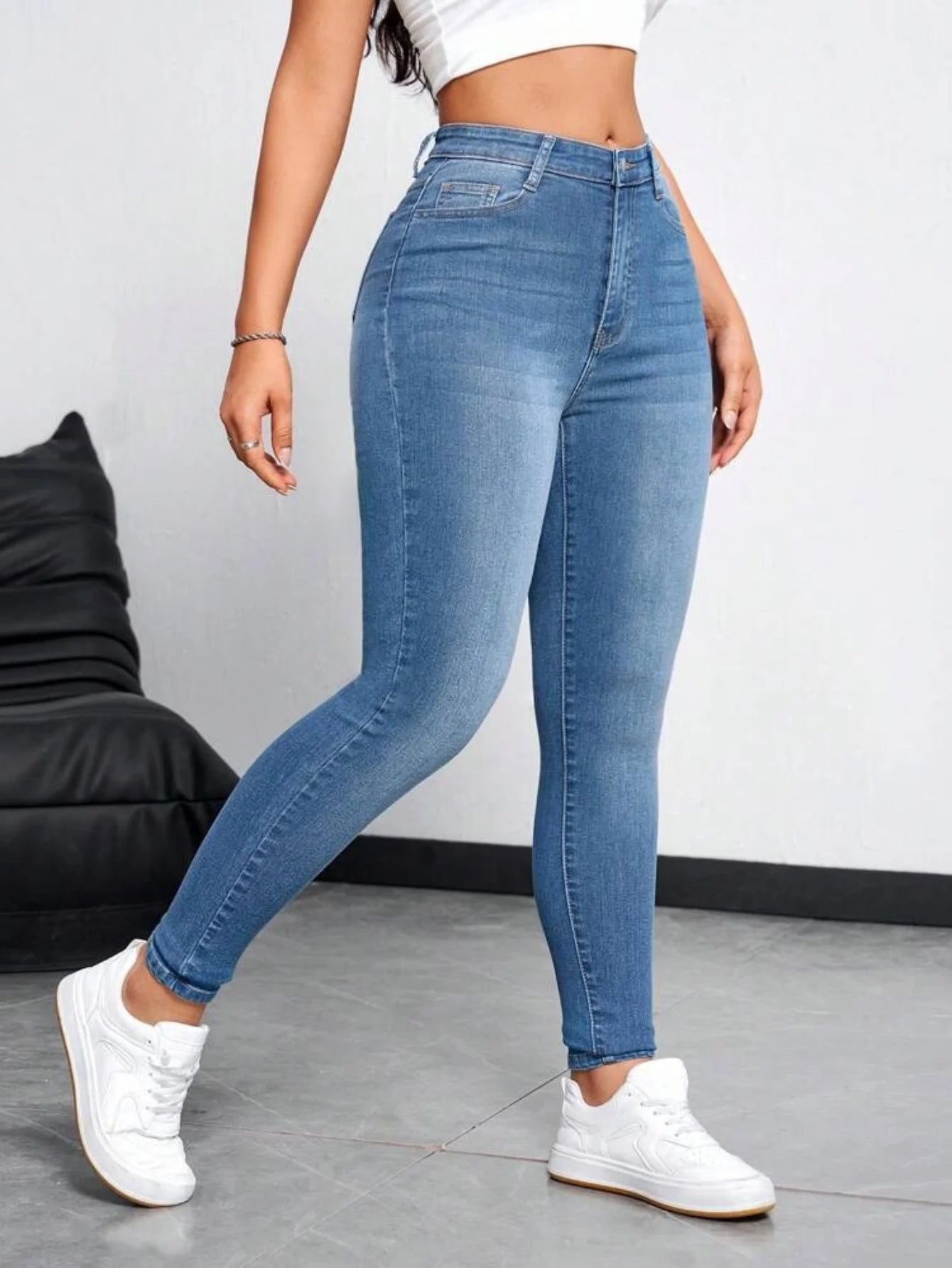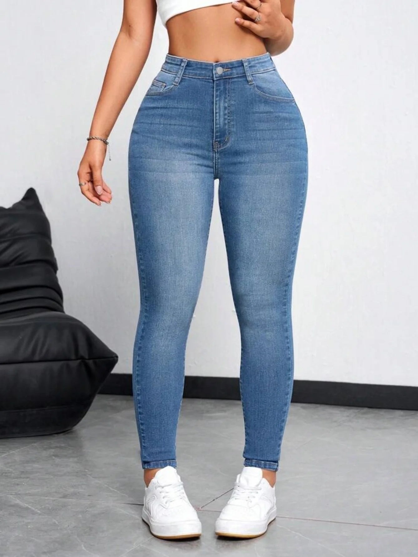 Plus size women's fashionable and versatile slim-fitting pure blue skinny jeans, stretch jeans, high waist and slim fit