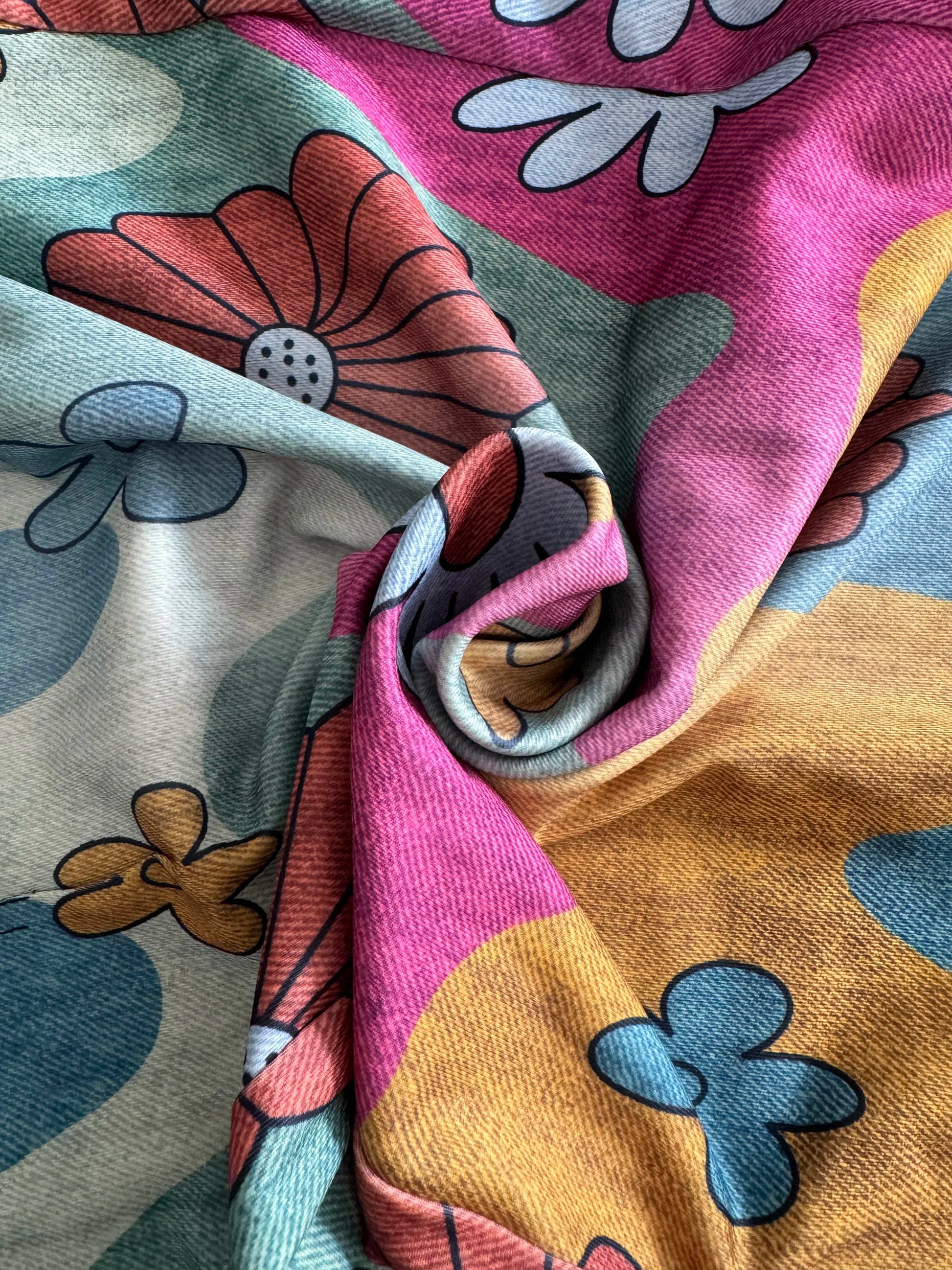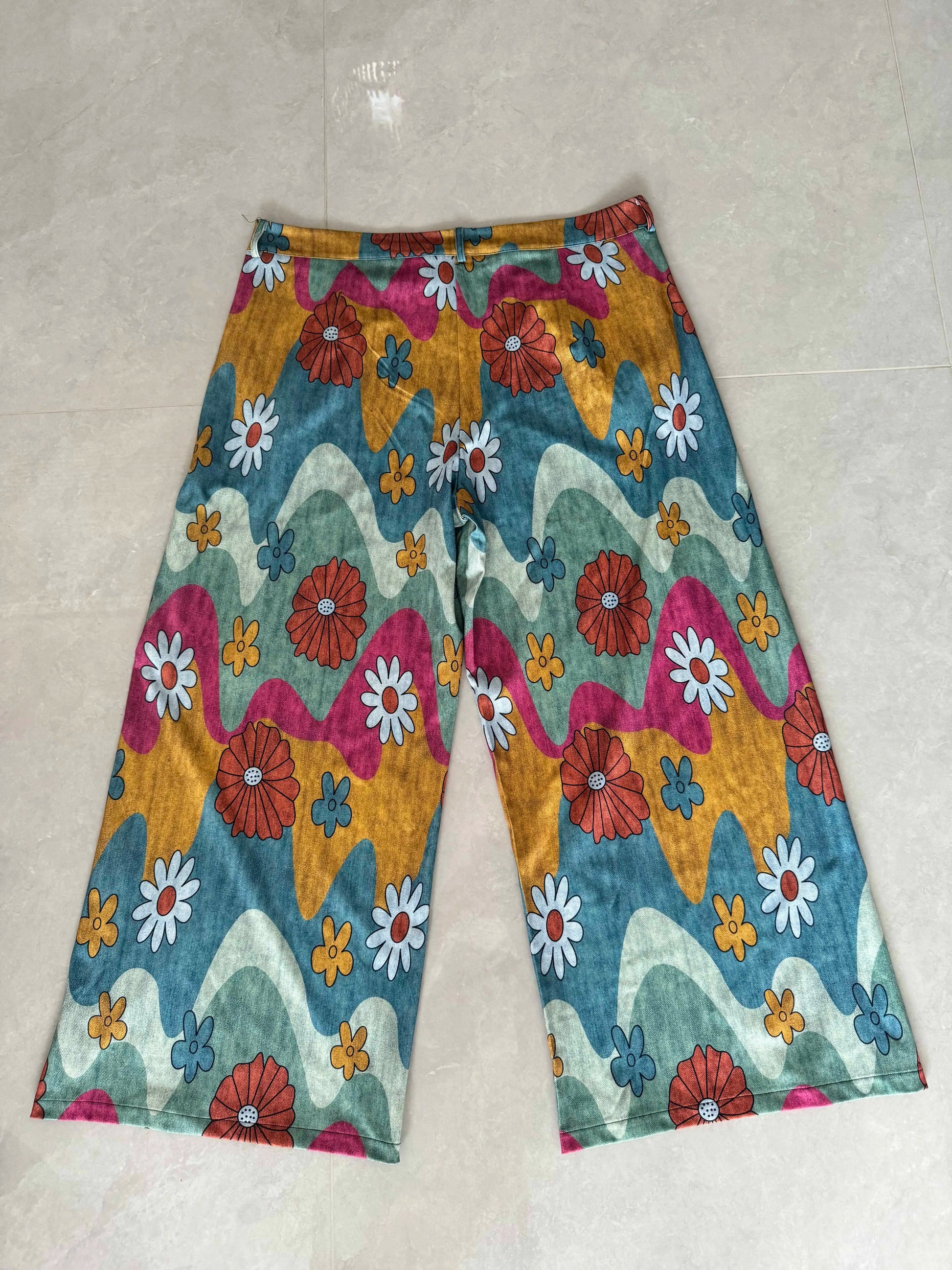 Plus Size Women's Thin Imitation Denim Bell-Bottom Pants with Sunflower and Daisy Flower Print Elastic Belt and Diagonal Flap Pocket Pantss, Comfortable and Fashionable in All Seasons