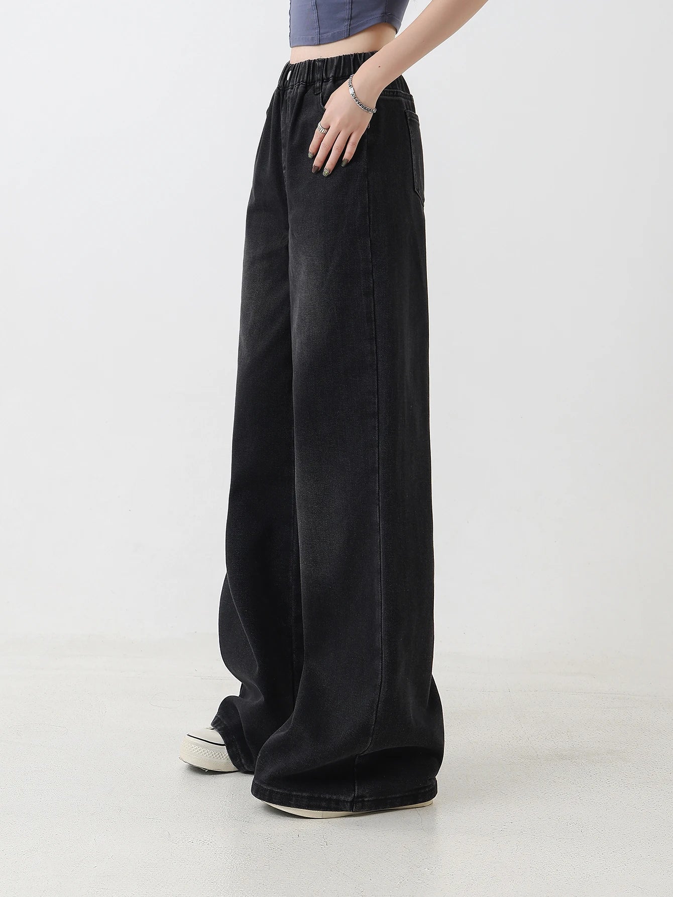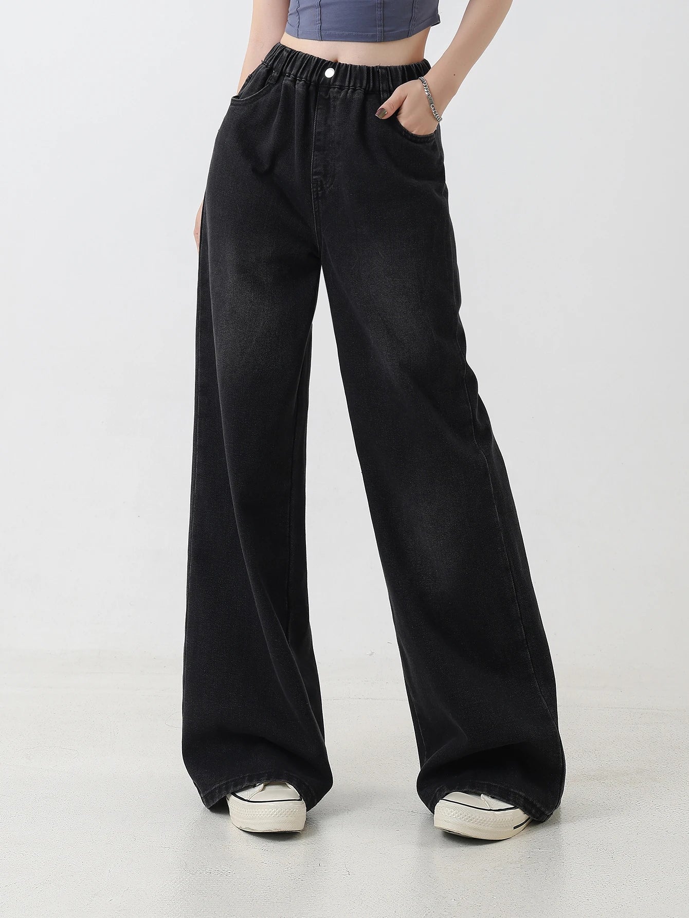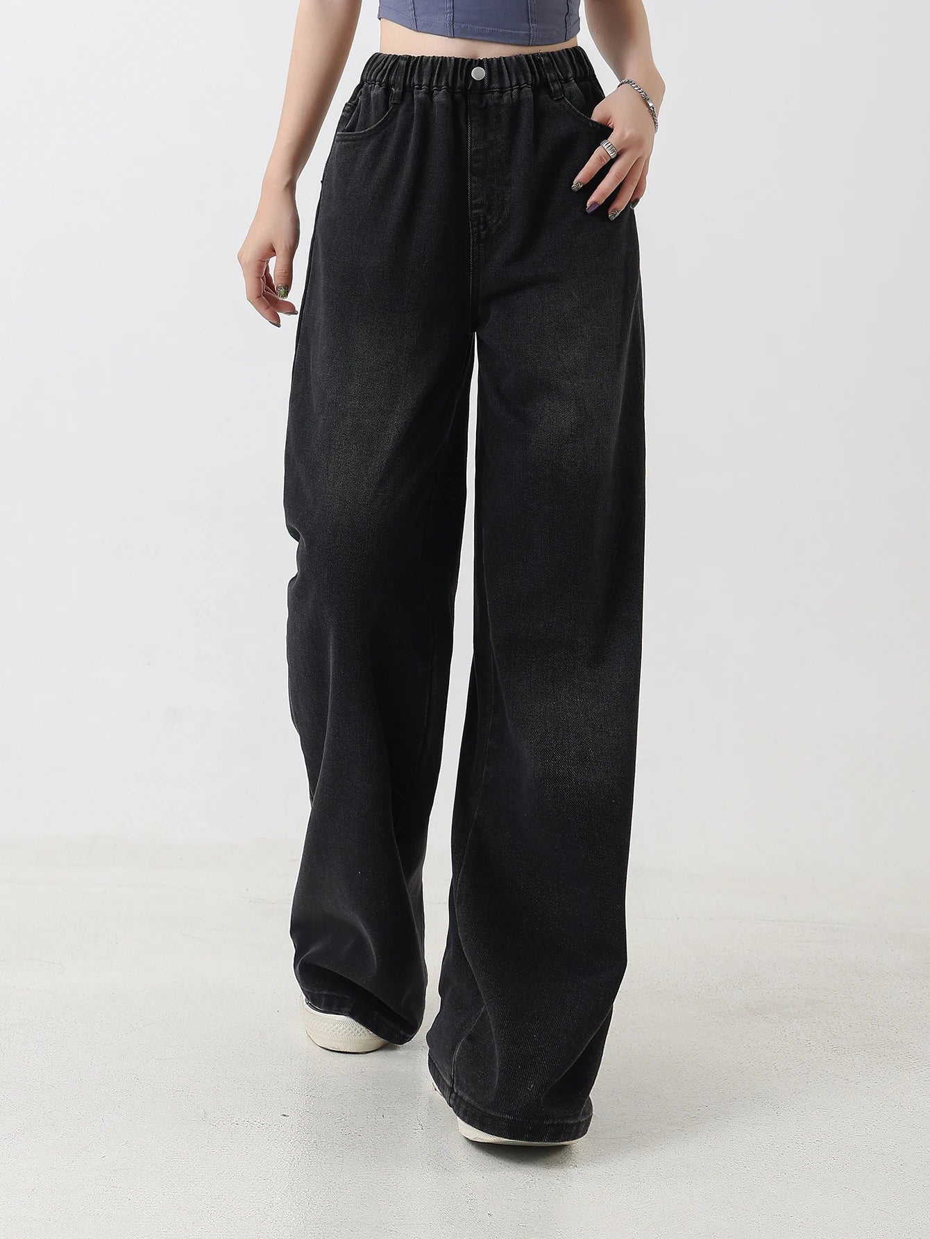 Preppy Style Versatile Black Washed Jeans for Girls – Vintage Loose Fit Straight-Leg Wide Pants, Trendy & Chic