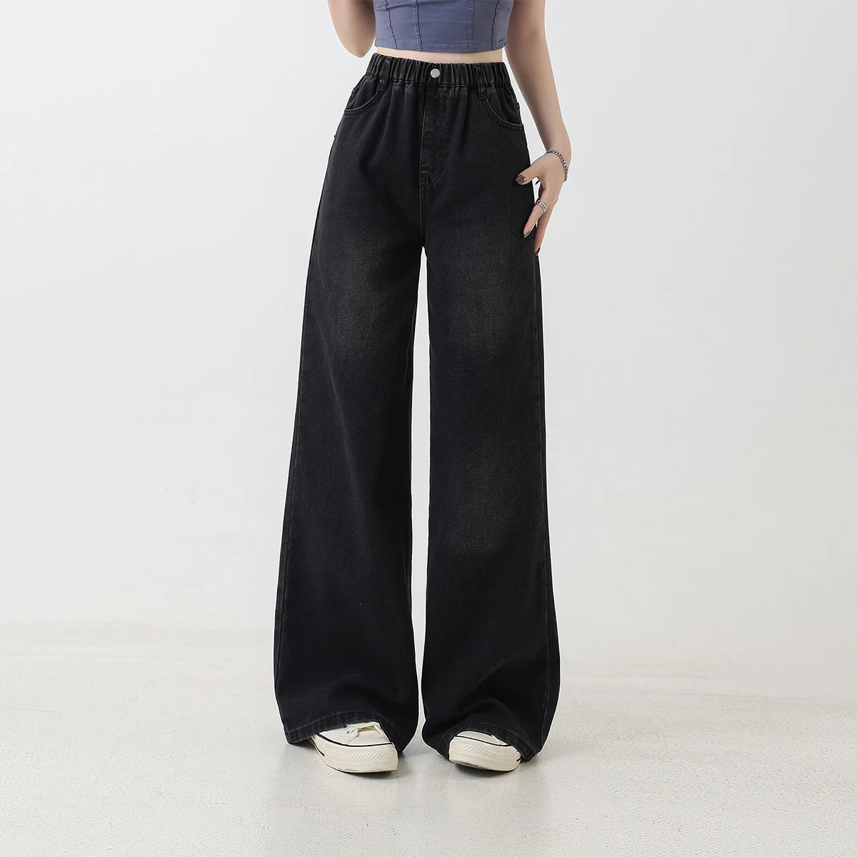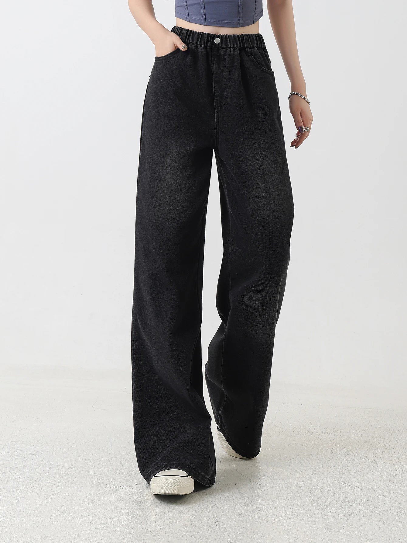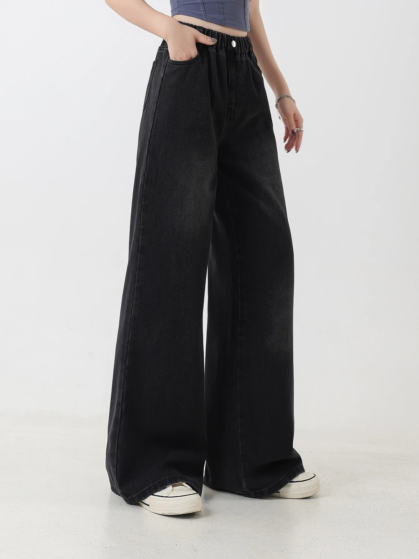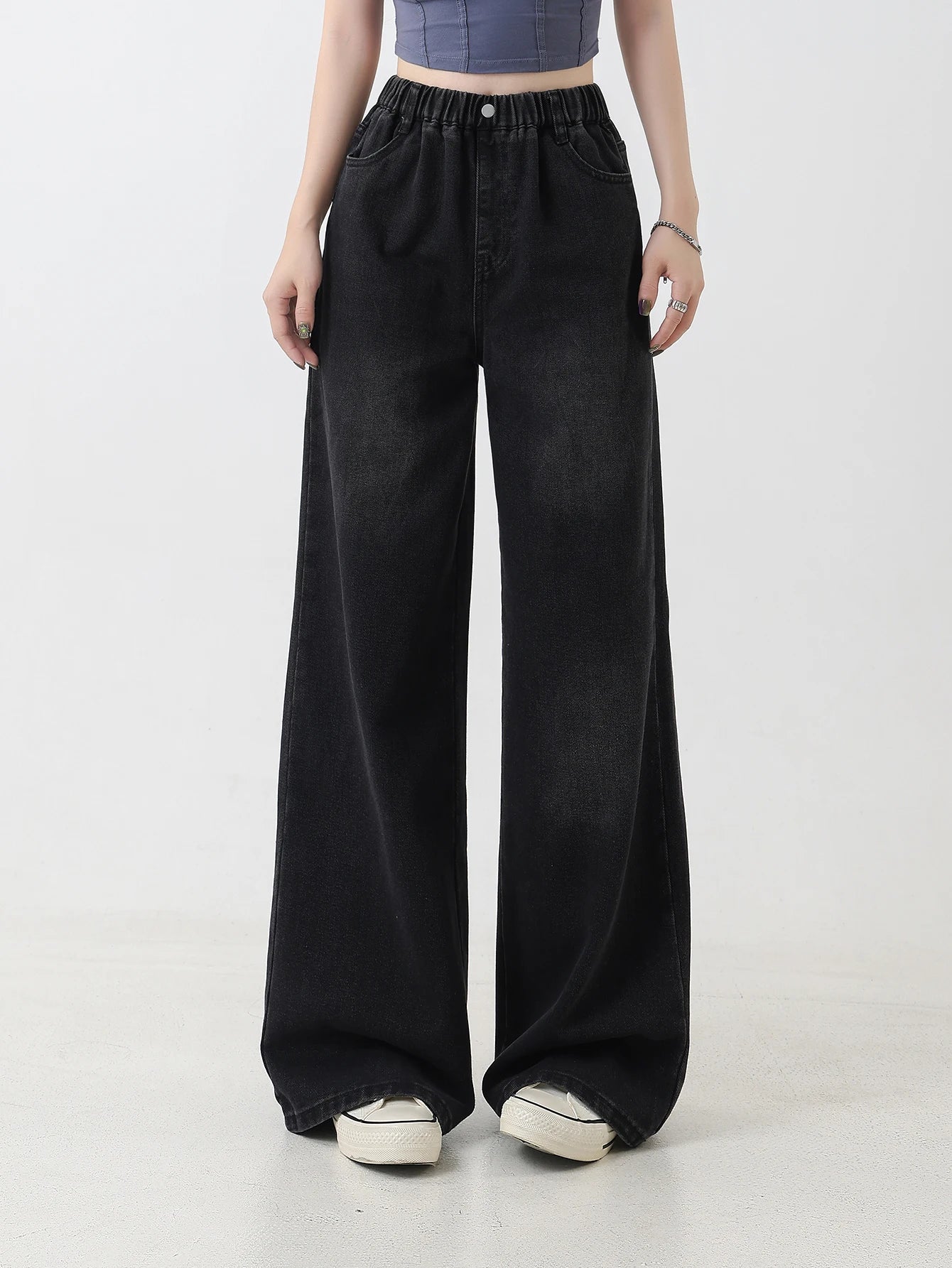 Preppy Style Versatile Black Washed Jeans for Girls – Vintage Loose Fit Straight-Leg Wide Pants, Trendy & Chic