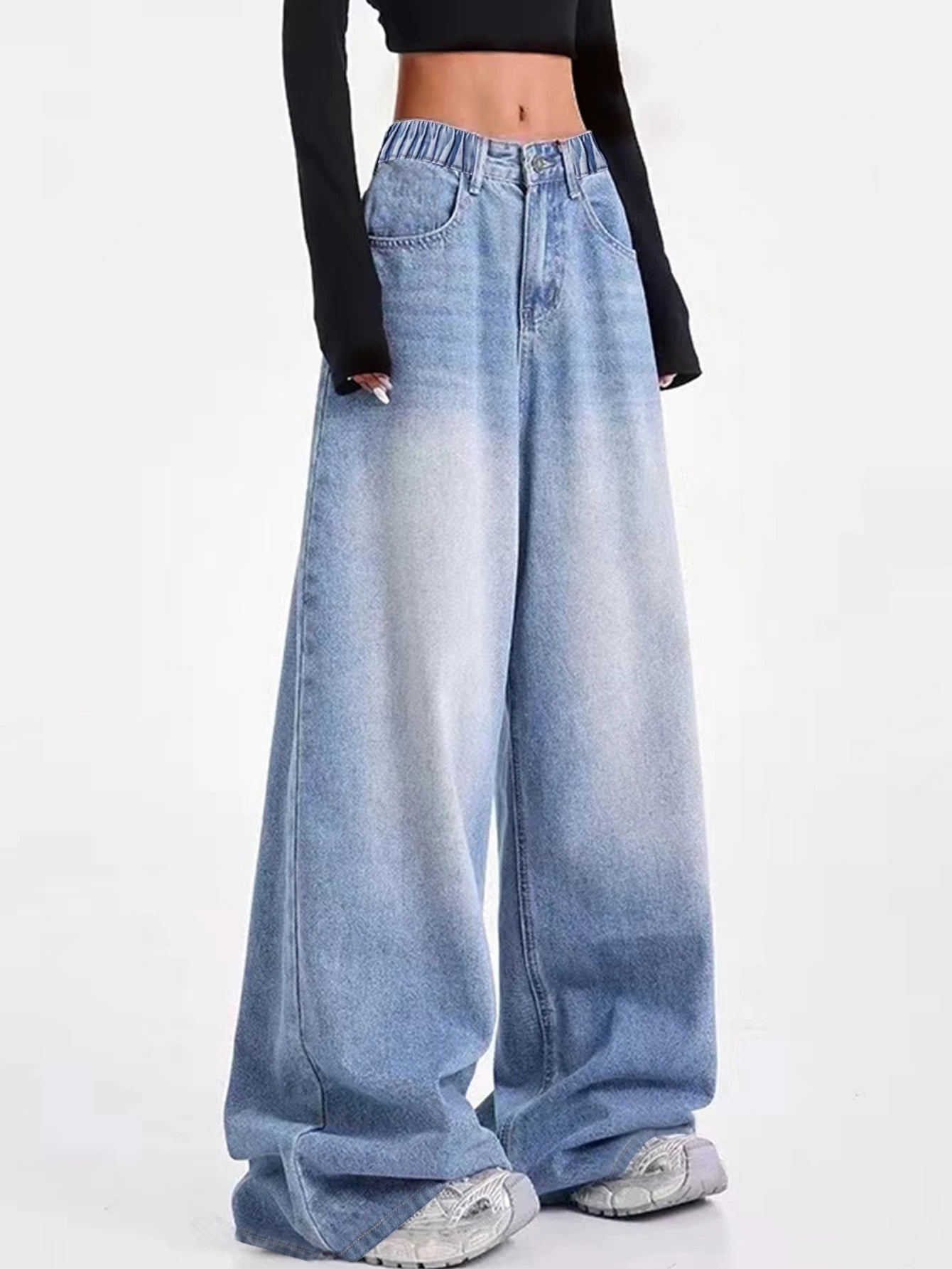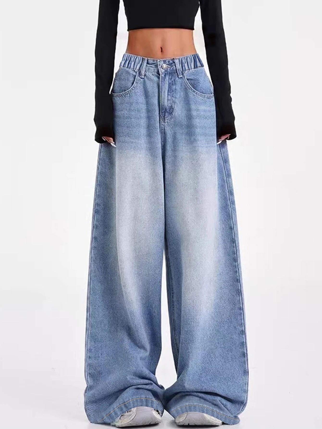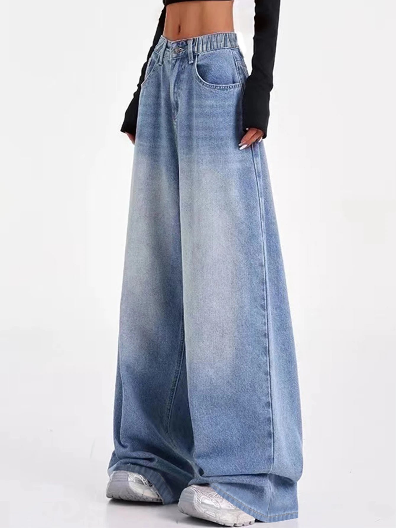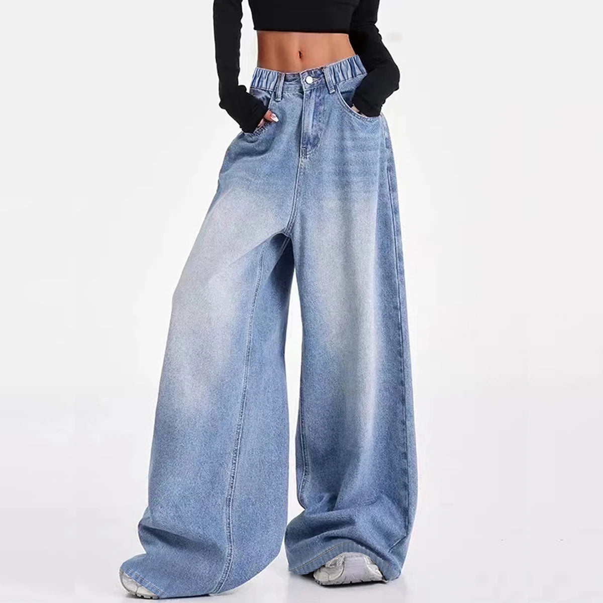 Vintage-washed blue American-style wide-leg straight-leg jeans for tween/teen girls – loose-fit, high-street casual long-length