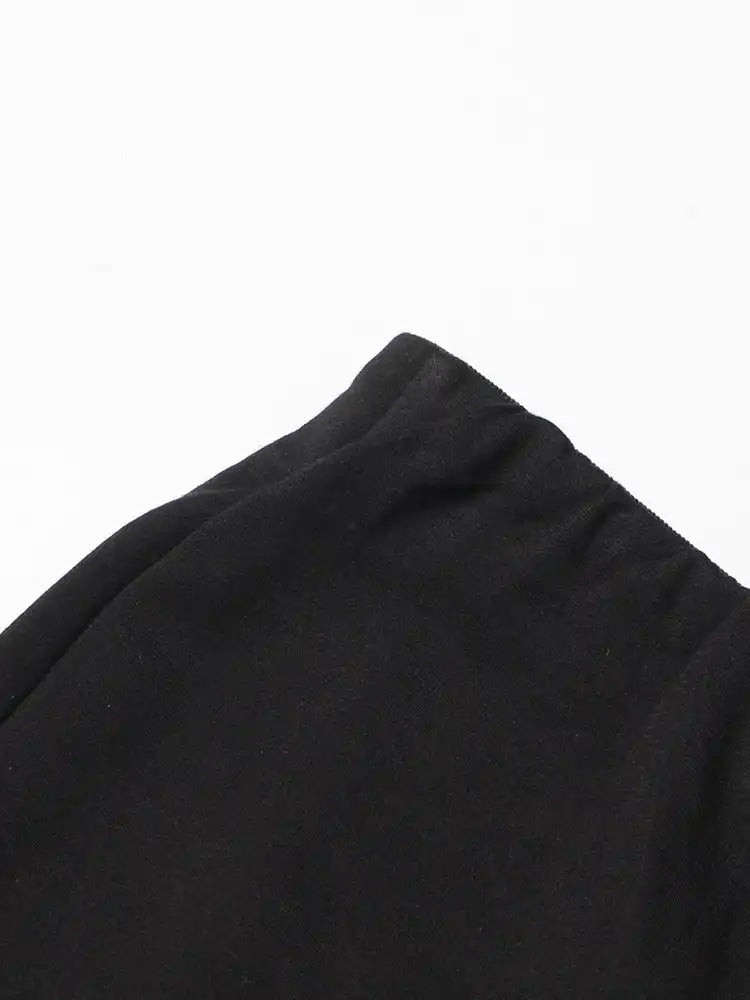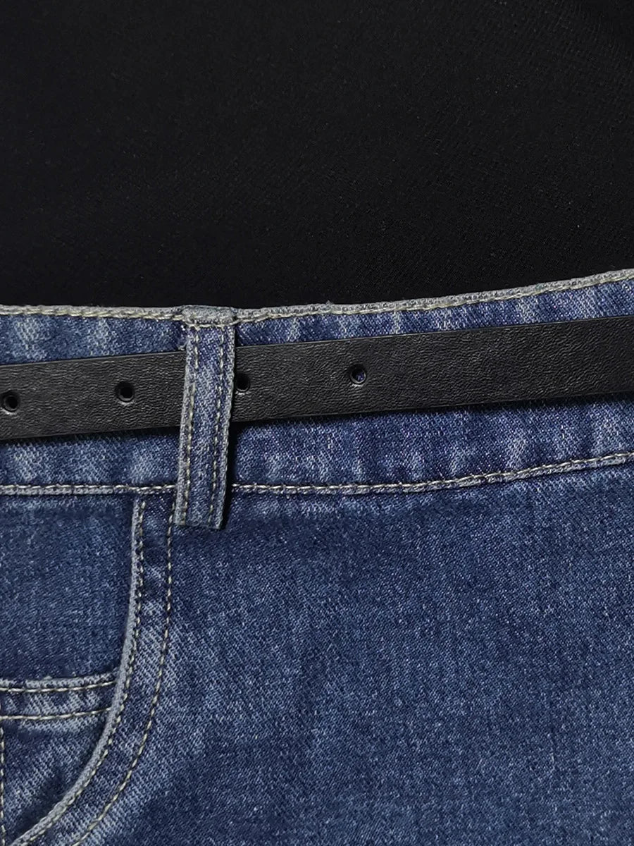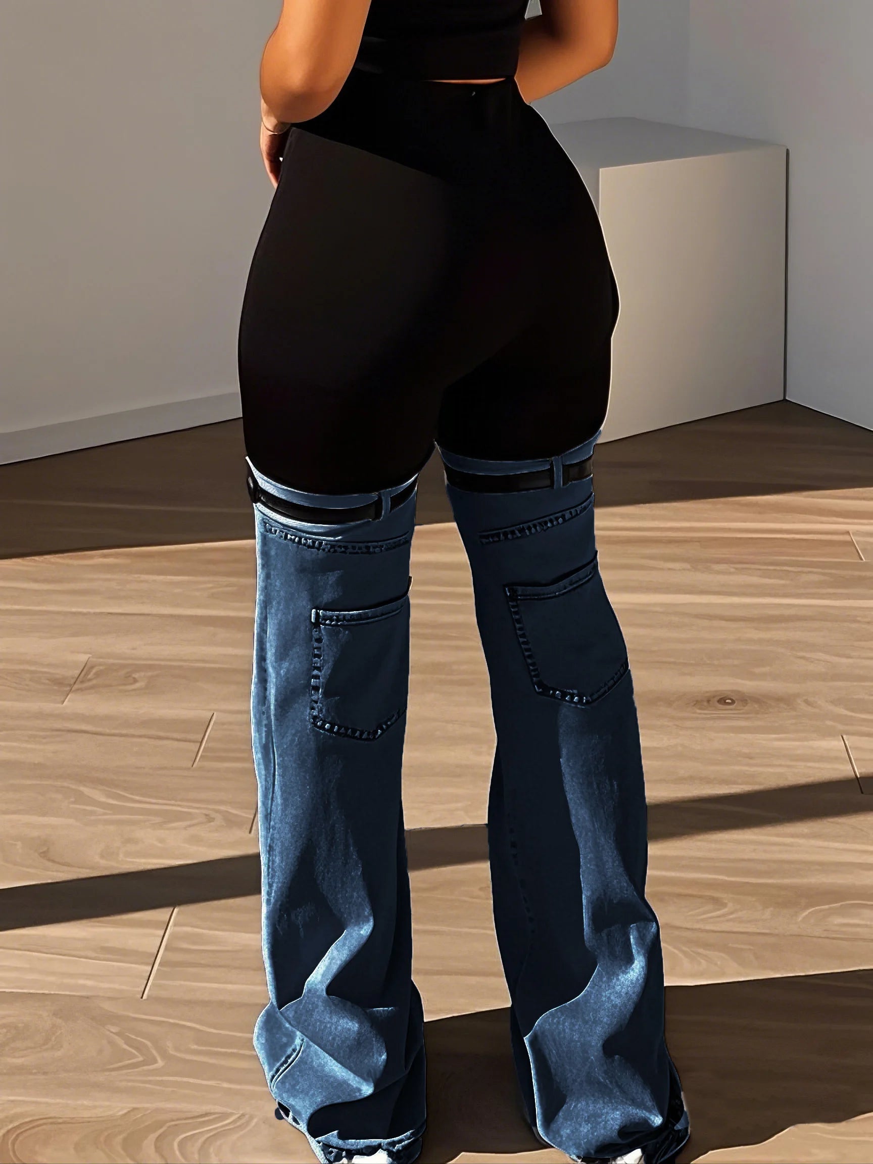 Women’s Trendy High Waist Patchwork Pants Black Bodycon Shorts Top with Blue Jean Bell Bottom Overlay and Punk-Inspired
