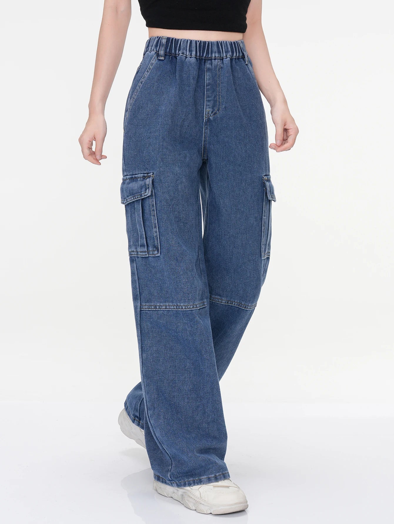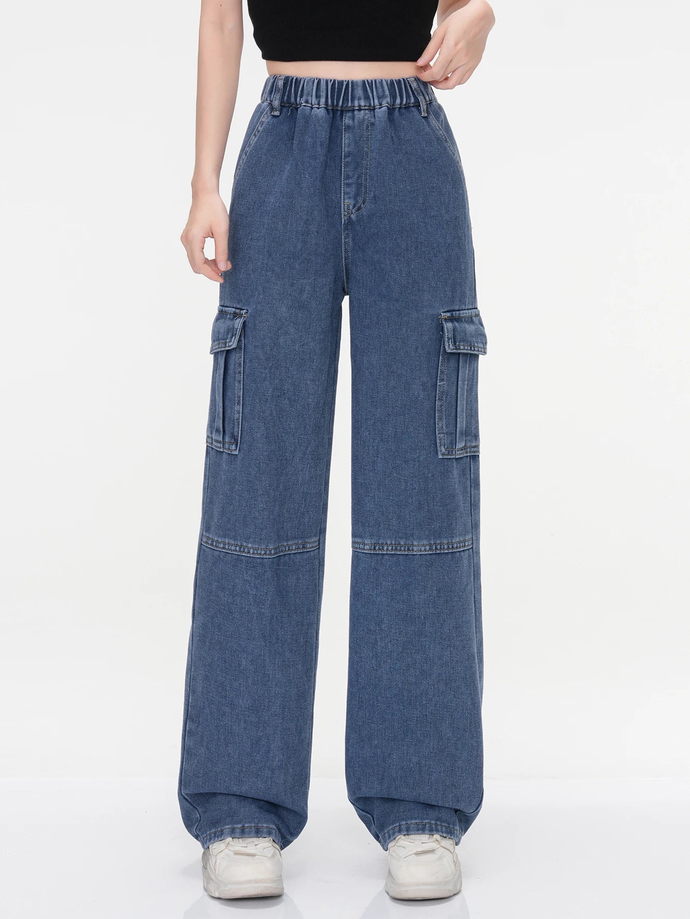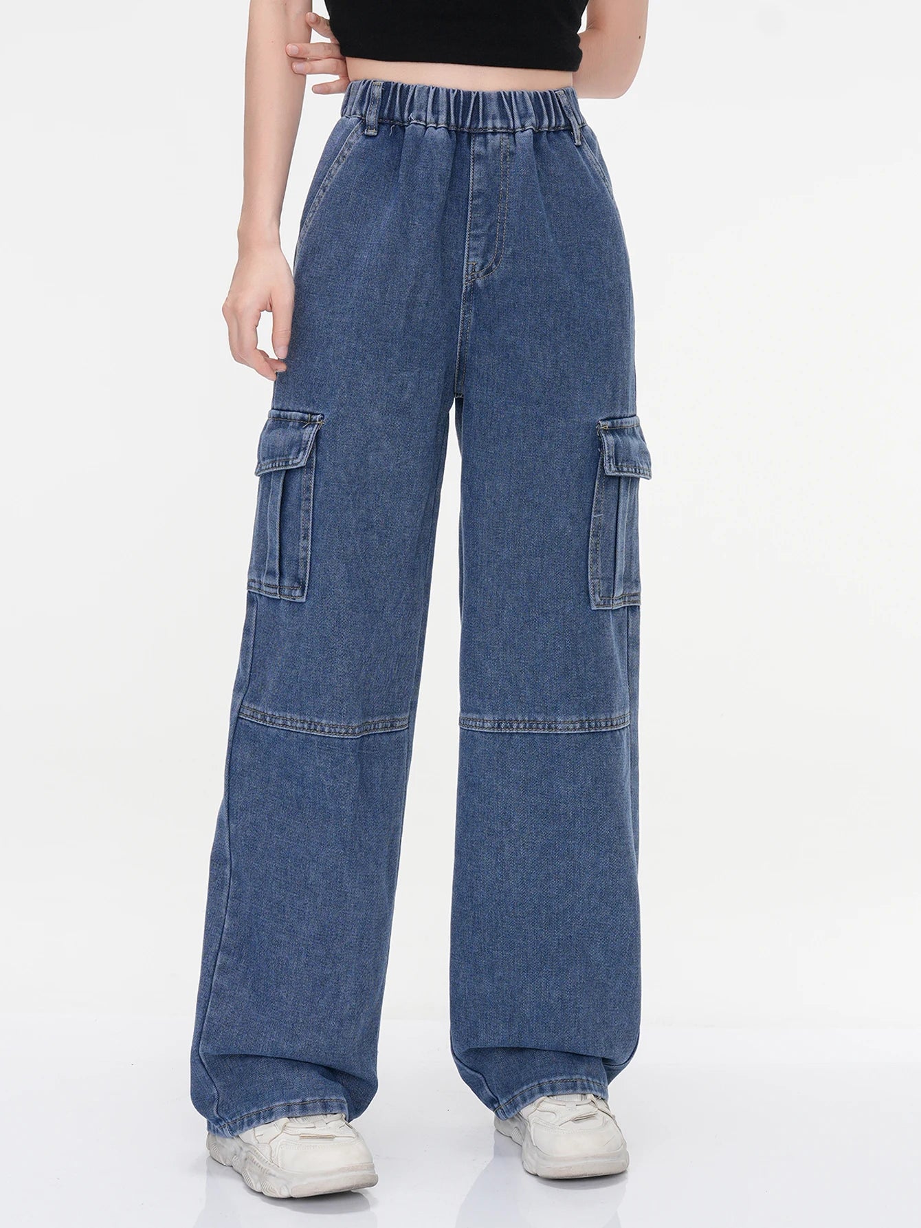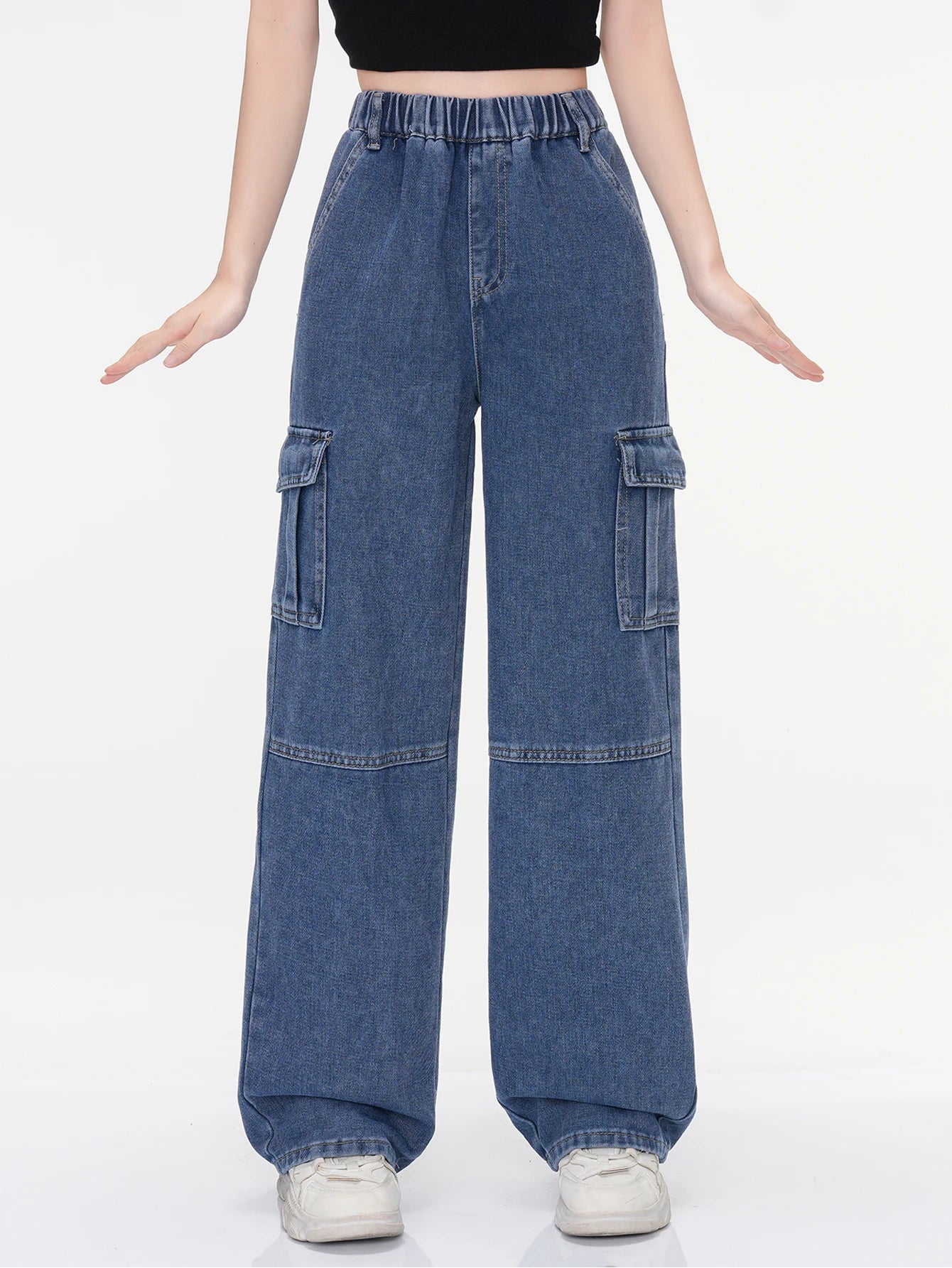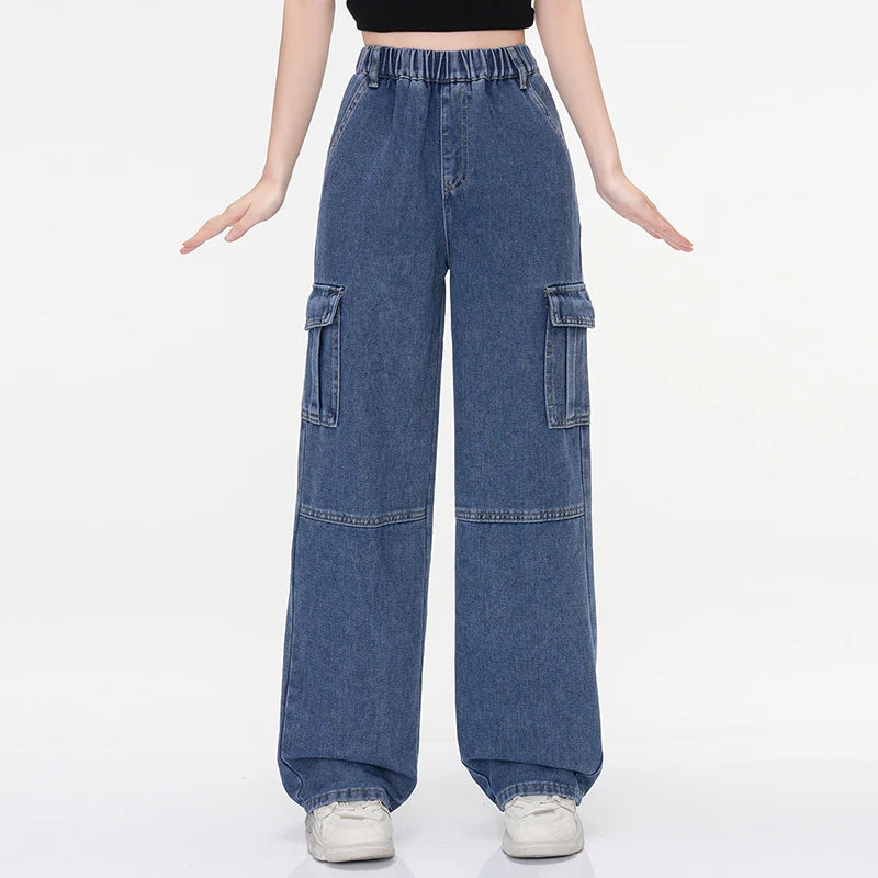 Women's Vintage Washed Cargo Jeans - High Waist Straight Wide Leg Denim Pants for Girls, Casual Stretch Slimming College Style R